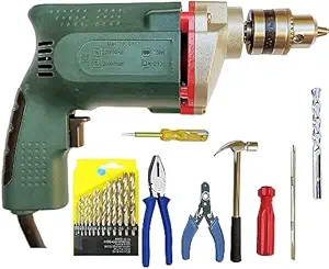Inditrust With 6 MONTHS WARRANTY New 10mm Electric Drill Machine with 13pc hss Plier Wire Cutter Tester Screwdriver Hammer Masonry bit Set Pistol Grip Drill